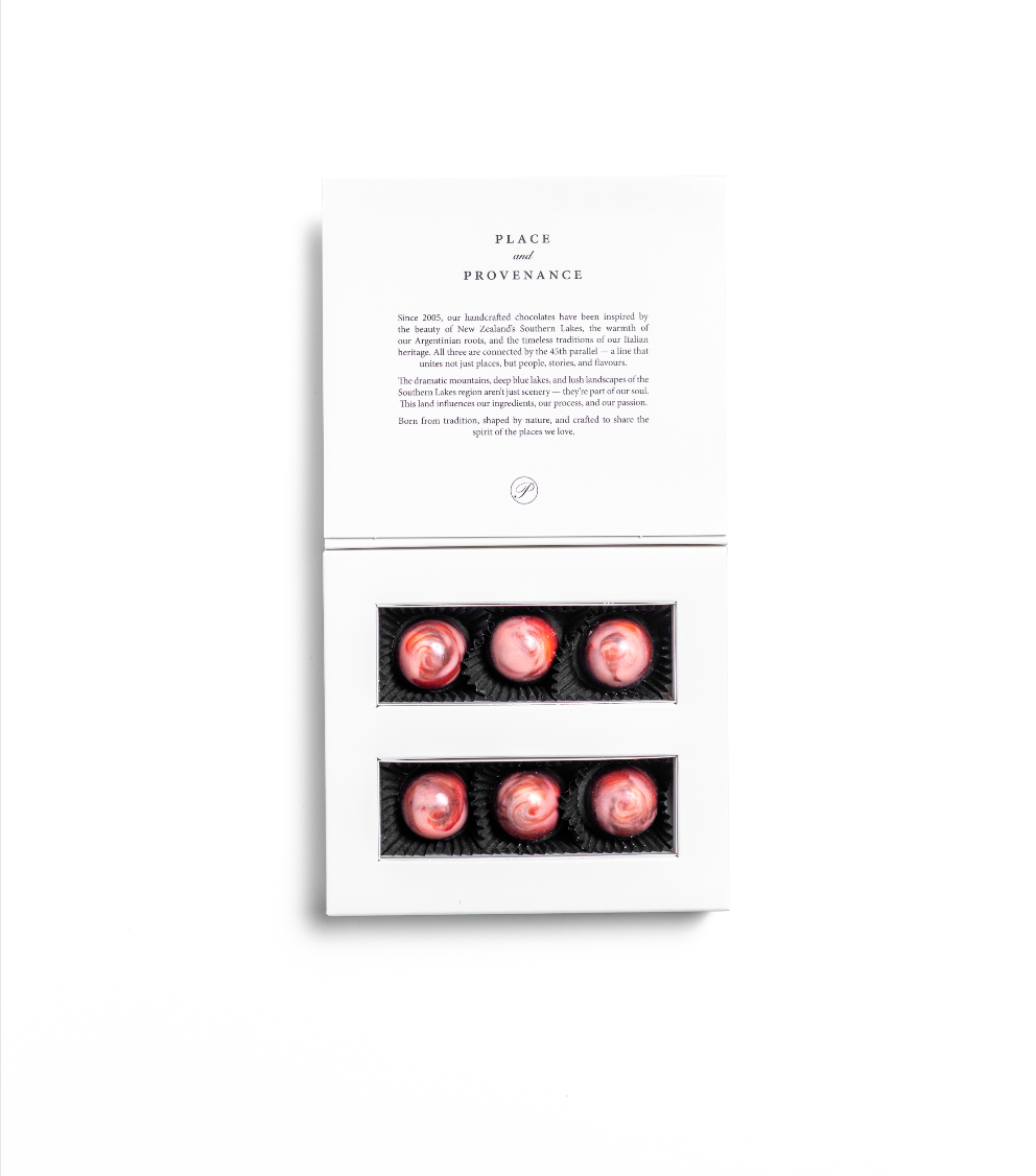 A smooth strawberry and white chocolate ganache, layered with a pistachio crunch. Hand-filled and encased in a 71% dark couverture chocolate shell. The ultimate decadence.
