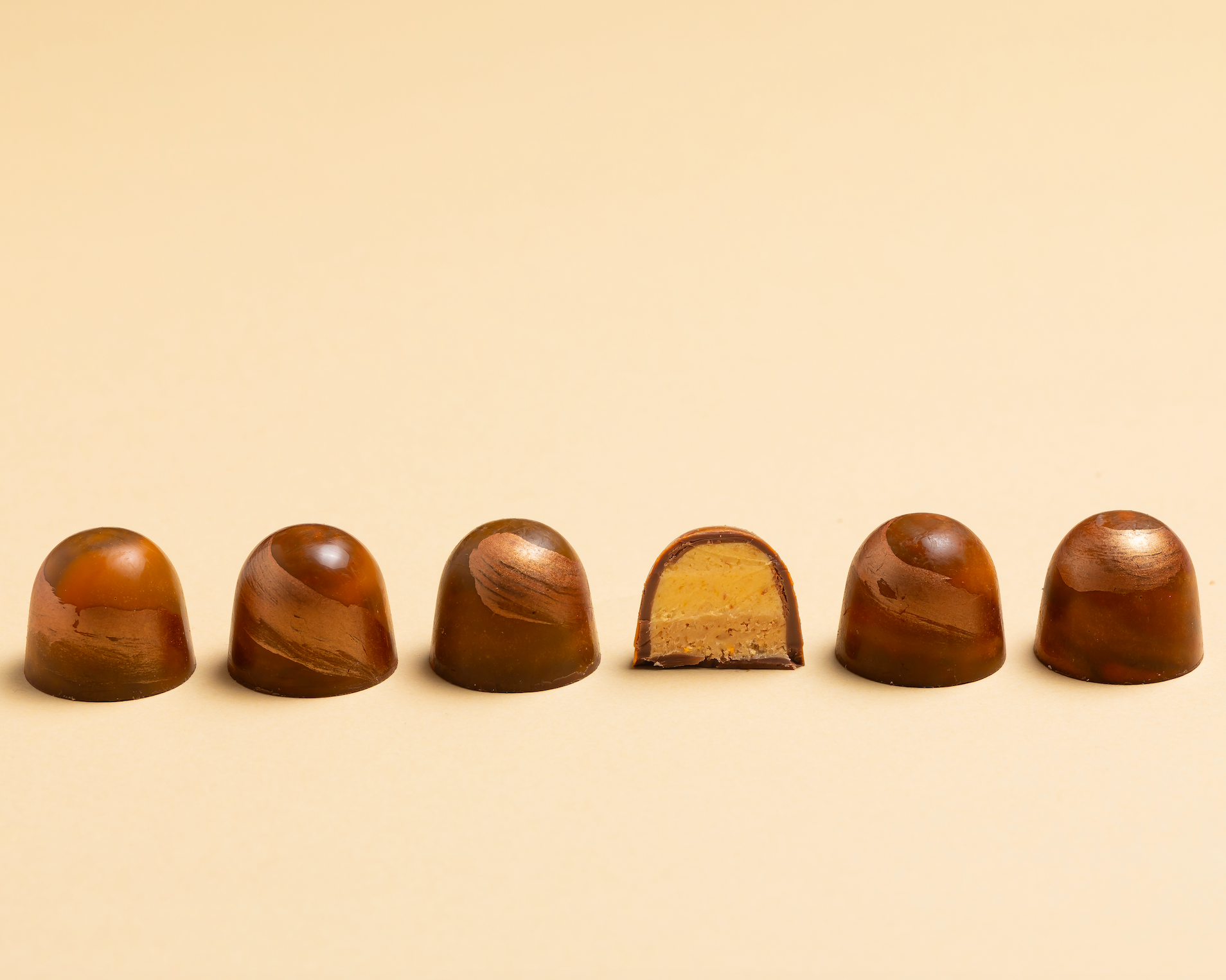Organic apricot and white chocolate ganache, layered with a macadamia crunch. Hand-filled and encased in a milk chocolate shell.