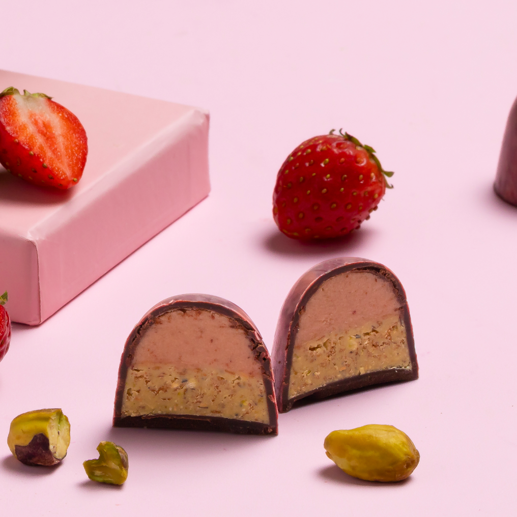 Strawberry, pistachio and white chocolate ganache encased in a 71% dark couverture chocolate shell.